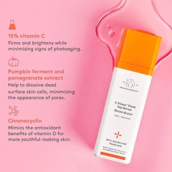Uso sugerido: Por la mañana, aplica una dosis en el rostro, el cuello, el pecho y el dorso de las manos limpios y secos, o mézclalo con tu batido diario para el cuidado de la piel de Drunk Elephant. ¡No olvides cubrirlo con protector solar!