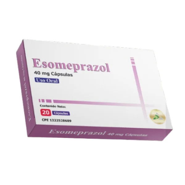 Esomeprazol 40 mg por 20 cápsulas de Dac55. Medicamento utilizado para reducir la acidez estomacal y tratar problemas gástricos como el reflujo.