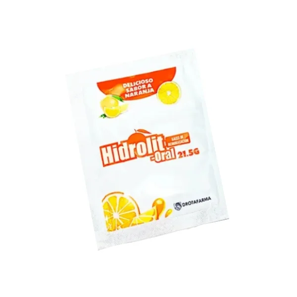Suero oral Hidrolit sabor naranja en presentación de 21.5 gr por sobre de Drotafarma. Formulado para la rehidratación y reposición de electrolitos en casos de deshidratación o diarrea.