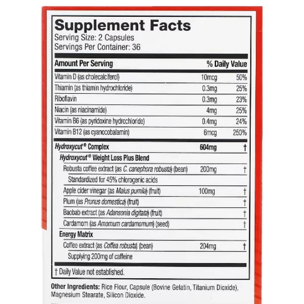 ¹ Los sujetos que tomaron el ingrediente clave Hydroxycut (C. canephora robusta) durante 60 días perdieron un promedio de 10,95 lb en comparación con el grupo de placebo, cuyos sujetos perdieron un promedio de 5,40 lb. Ambos grupos siguieron una dieta con bajo contenido calórico. En otro estudio de 8 semanas, los sujetos que tomaron C. canephora robusta perdieron un promedio de 3,7 lb en comparación con el grupo de placebo, cuyos sujetos perdieron 1,25 lb. Ambos grupos siguieron una dieta con bajo contenido calórico e hicieron ejercicio físico moderado.