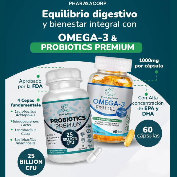 Suplemento Probiotics Premium de Pharmacorp, con 25 billones de cultivos vivos por cápsula, presentación de 60 cápsulas. Formulado para apoyar la salud digestiva y el sistema inmunológico con una combinación de probióticos de alta calidad.