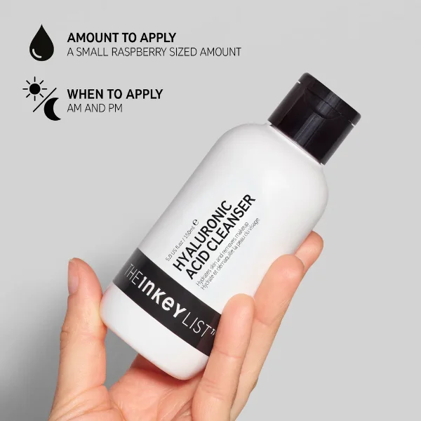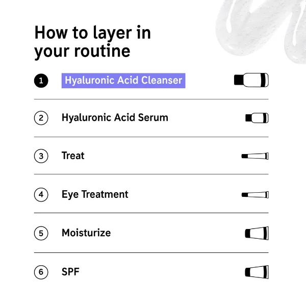 - Masajee suavemente una pequeña cantidad del tamaño de una frambuesa de Limpiador de ácido hialurónico sobre el rostro y el cuello humedecidos, luego enjuague bien.